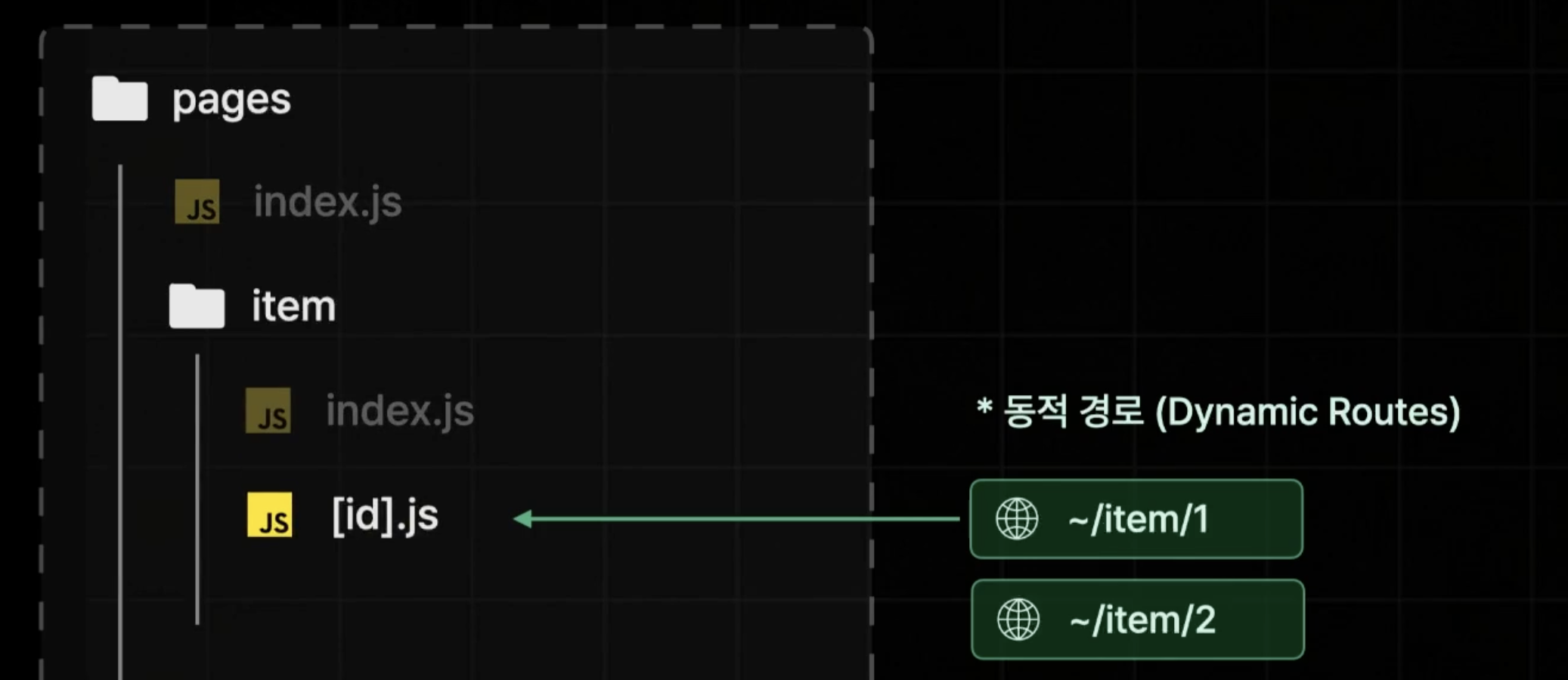 동적 경로는 대괄호([])로 감싸서 정의합니다.